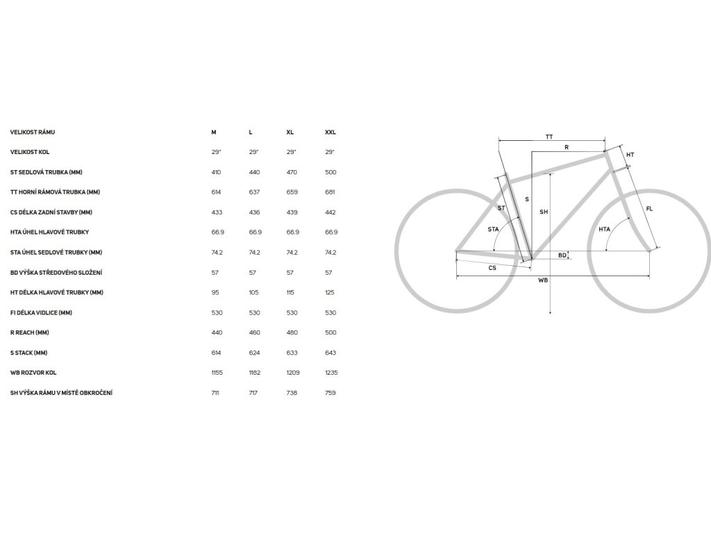 Podrobný rozpis geometrie najdete v tabulce mezi obrázky. Pří výběru velikost vyjděte z výšky své podstavy. Pokud jste na rozhraní velikostí, tak pro sportovnější jízdu a zvýšení obratnosti kola zvolte velikost spíše menší, a pro jistější a stabilnější jízdu zvolte velikost větší.