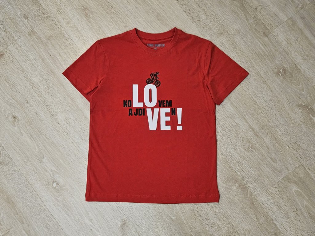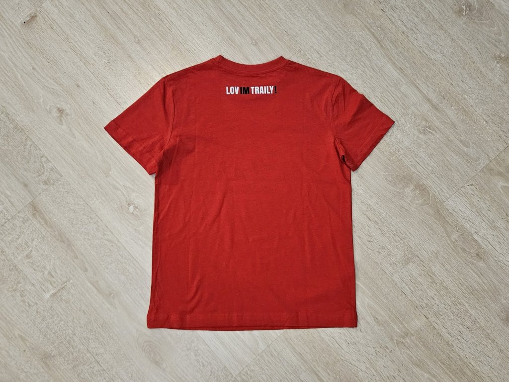 Tohle je dětské tričko v červené barvě, které bude slušet klukům i holkám. Motiv jinak existuje i v ženské a chlapácké verzi trika. Přední motiv zezadu doplňuje hláška LOVim TRAILY! Máme i verzi pro mámu a tátu ;)